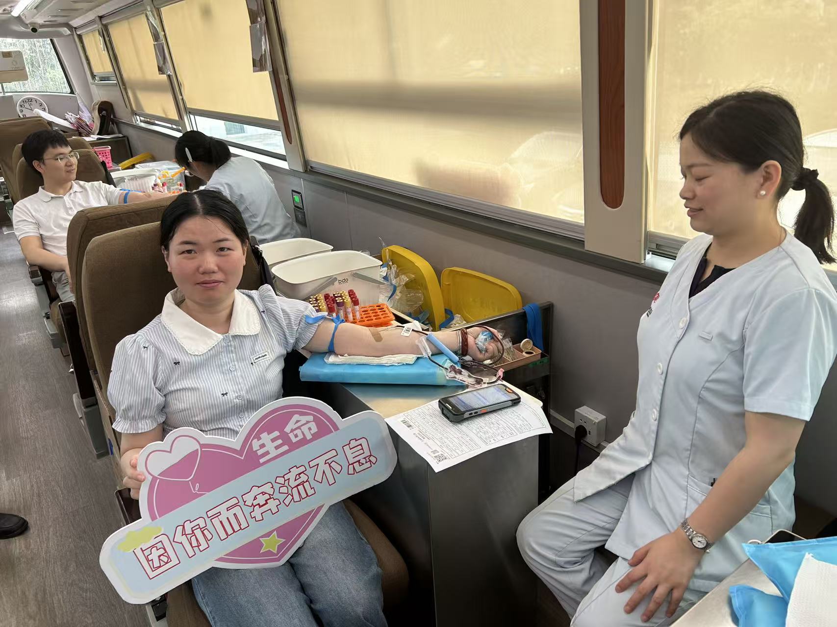 与往年相比,,,,,,,今年的献血运动有了暖心升级:从以往员工自行前往血站,,,,,,,转变为献血车直接开进办公点。。。。。这一改变让献血越发便捷,,,,,,,组织与后勤服务也越发知心。。。。。